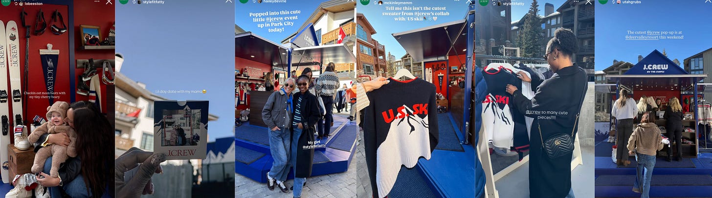 J.Crew continues to host pop-ups around their U.S. Ski & Snowboard merch. After Aspen last week, they popped up in Park City this week, with influencers stopping by to drive awareness.