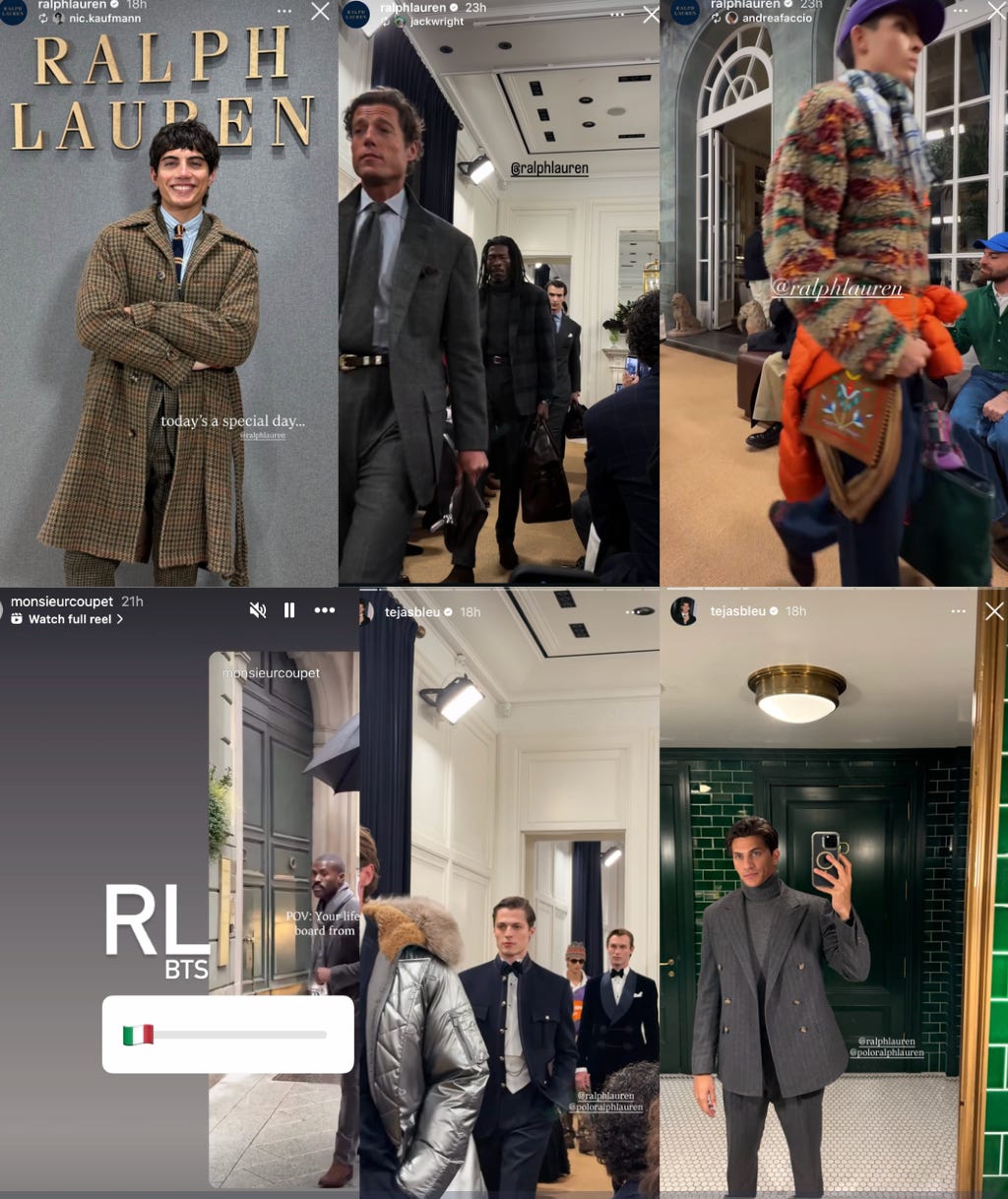 Ralph Lauren returned to Milan for their men’s show for the first time in two decades, with influencers across categories in attendance. From private chef Tejas Ke’alohi Jhaveri, to comedian Benito Skinner, to menswear creator Georges Coupet, the casting continues to prove they know how to stay culturally relevant across generations. Their team truly feels everywhere right now—major kudos for consistently getting the right influencers on the ground at every moment. Excited to see what they have in store in Milan for the Winter Olympics in just a few weeks.