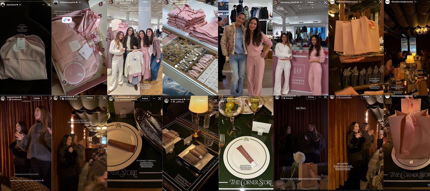 Summer Fridays had a big week. Their second Summer Fridays x Gap drop officially launched, with influencer seeding going out ahead of the release. Founders Lauren Ireland and Marianna Hewitt hosted an event at the NYC Gap store, followed by a more intimate dinner at Corner Store with core NYC influencer partners.