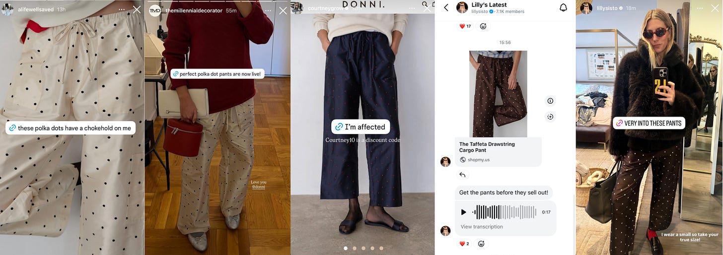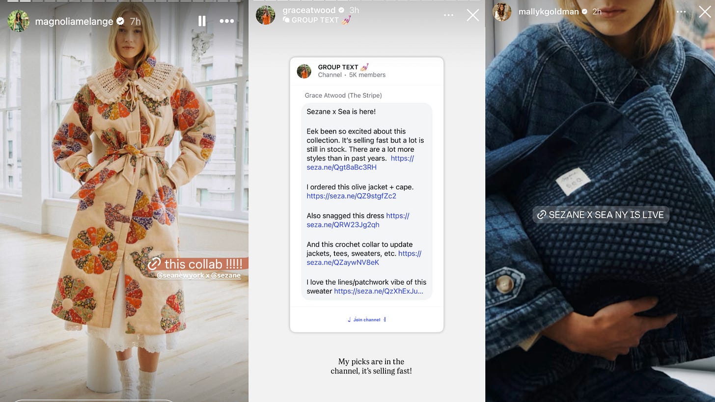The Sezane x Sea New York collaboration appears to be exclusive to Sézane’s site. Similar to the Donni rollout, influencers are rounding up favorites via broadcast channels and Stories. Instead of a single high-impact push, they’re leaning on their community to shape how the collection shows up across audiences.