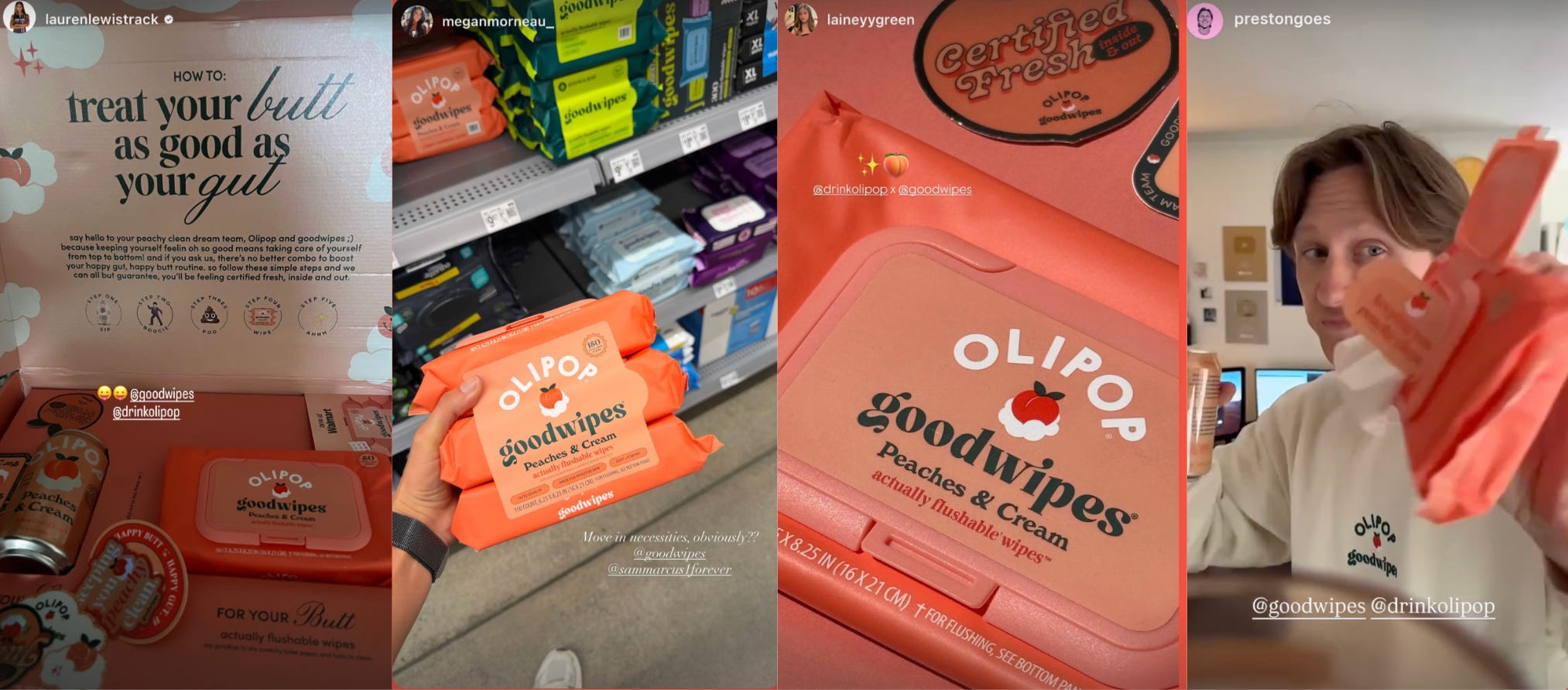 Olipop x Goodwipes teased a ‘Peaches & Cream Flushable Wipes’ collab on April Fool’s…which actually turned into a real product launch at Walmart and on Goodwipes.com. Creators were seeded ahead of time and shared mailers across both days, blurring the line between joke and launch.